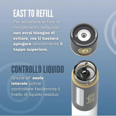 La sigaretta elettronica monta una cartuccia pod vuota ricaricabile con serbatoio della capacità di 1,0ml che si riempie dall'alto spostando di lato il tappo superiore e che consente di monitorare il livello del liquido tramite la finestrella trasparente laterale. La pod integra una resistenza a mesh da 1.5Ω che offre un tiro di guancia molto contrastato. Il tiro è automatico, perciò basta aspirare dal drip tip per attivare la vaporizzazione.