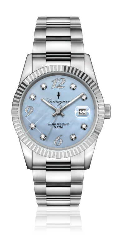 Cassa acciaio – Finitura lucida/satinata – Ghiera zigrinata lucida – Diametro ø 36 mm – Altezza cassa 10,5 mm – Vetro minerale con lente a ore 3 – Apertura quadrante ø 30 mm – Quadrante madre perla azzurra, indici applicati in rilievo con pietre trasparenti – Corona acciaio chiusa a vite – Fondello acciaio serrato a vite – Movimento quarzo, Citizen Miyota: ore, minuti, secondi, data – Bracciale acciaio solido lucido/satinato, 20/18 mm – Fibbia acciaio satinato, deployante – Water Resistant 5 ATM