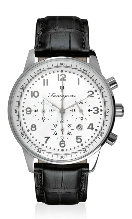 Cassa Acciaio – Finitura lucido – Diametro ø 43 mm – Altezza cassa 12 mm – Vetro minerale – Apertura quadrante ø 39 mm – Quadrante lucido, numeri e index applicati – Corona acciaio serrata a pressione – Fondello acciaio serrato a vite – Movimento Miyota OS20 – Funzioni ore, minuti, secondi, cronografo, 24 h, data – Cinturino vera pelle 22/20 mm – Fibbia acciaio – Water Resistant – Peso 55 gr.