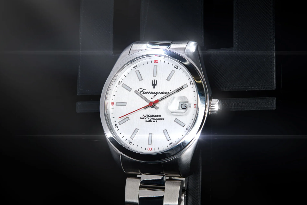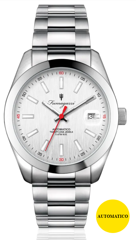 Cassa acciaio – Finitura lucida/satinata – Diametro ø 39 mm – Altezza cassa 10,5 mm Vetro minerale con lente a ore 3 – Apertura quadrante ø 32 mm – Quadrante silver spazzolato con indici applicati in rilievo – Corona acciaio chiusa a vite – Fondello acciaio serrato a vite – Movimento meccanico automatico, 8215 Miyota: ore, minuti, secondi, data Bracciale acciaio solido lucido/satinato, 20/18 mm – Fibbia deployante in acciaio satinato – Water Resistant 5 ATM
