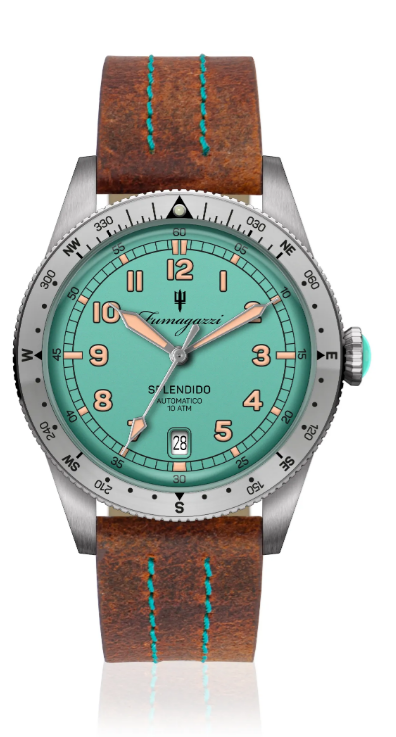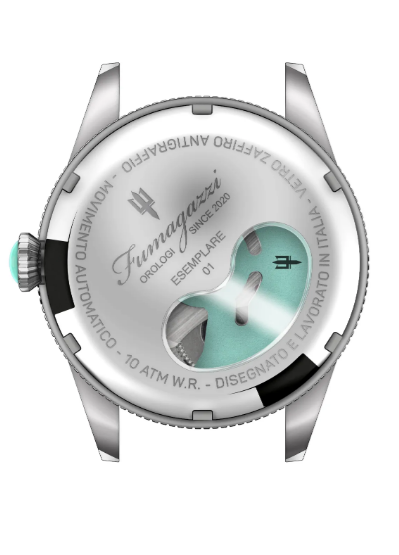 Cassa acciaio con ghiera girevole bidirezionale e lunetta in alluminio con punti cardinali – Finitura lucida/satinata – Diametro ø 39 mm – Altezza cassa 10,5 mm – Vetro zaffiro – Apertura quadrante ø 32 mm – Quadrante bombato e satinato, colore acquamarina – Corona acciaio chiusa a vite con cabochon acquamarina– Fondello acciaio serrato a vite con oblò in vetro e massa oscillante a vista, customizzata acquamarina con logo – Movimento meccanico automatico Seiko: ore, minuti, secondi, data – Cinturino artigianale in vera pelle Made in Italy vintage, con doppia cucitura realizzata a mano colore acquamarina, 20/18 mm – Fibbia acciaio – Water Resistant 10 ATM